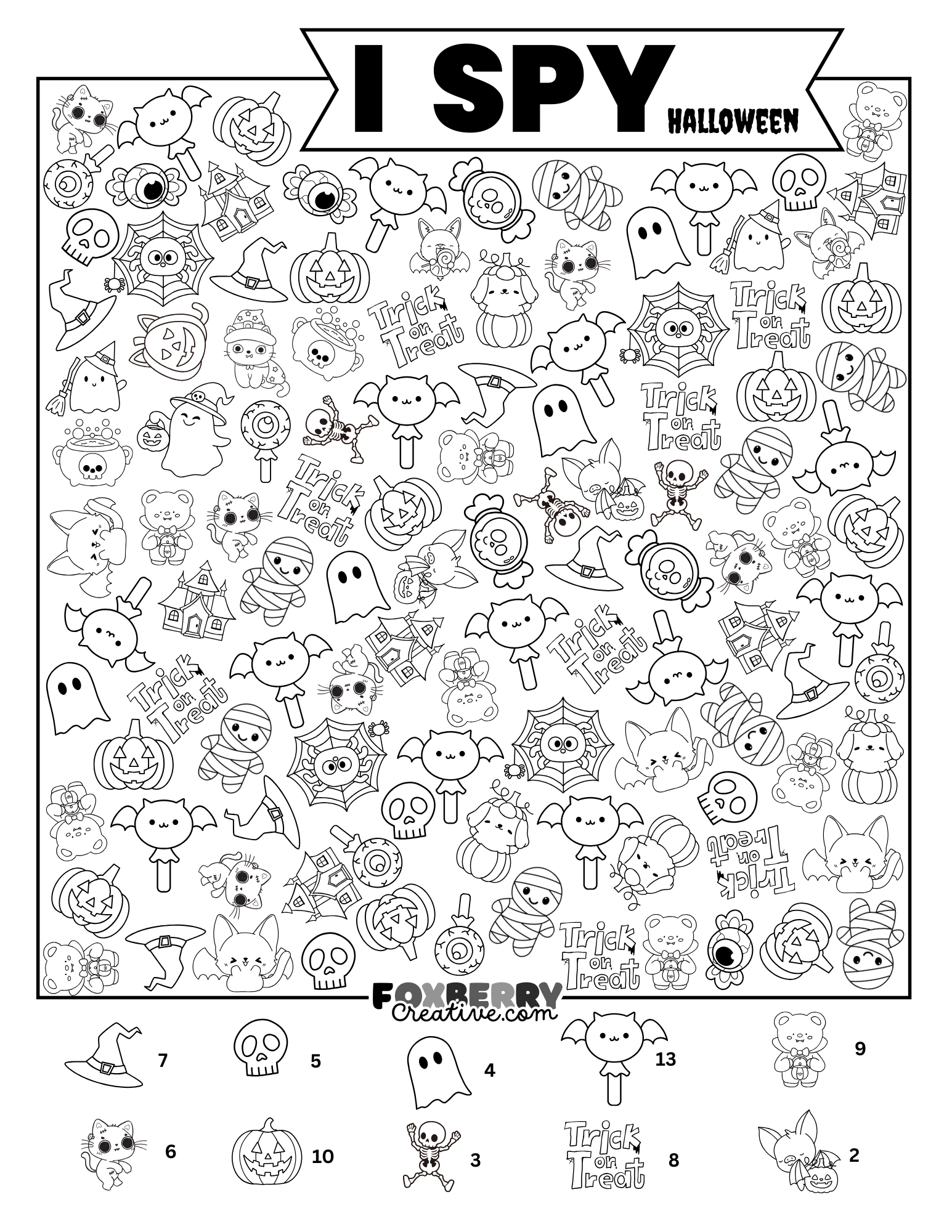 This I Spy page is designed to be both fun and creative. Kids can count how many of each Halloween item they can find — and when they’re done, they can color in the adorable illustrations! The line art is intentionally clean and bold, making it perfect for coloring with crayons, markers, or colored pencils. It’s a great way to keep little hands busy and let imaginations run wild.